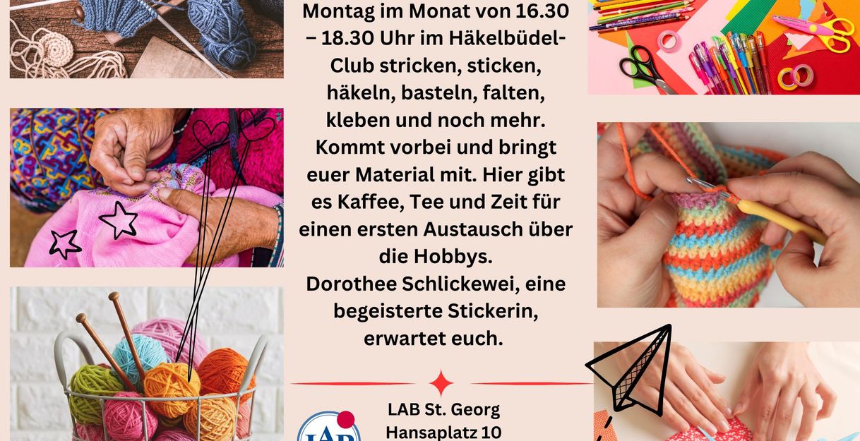 The LAB St. Georg offers everyone from the St. Georg district and the surrounding area who loves handicrafts the opportunity to meet in a friendly atmosphere, to exchange ideas and to pursue their hobby. In the Häkelbüdel Club you can knit, embroider, crochet, do crafts, fold or glue and much more. Everyone brings their own work materials, we have coffee and tea on site. Dorothee Schlickewei, an enthusiastic knitter, is happy about anyone who would like to come along and enrich the group.